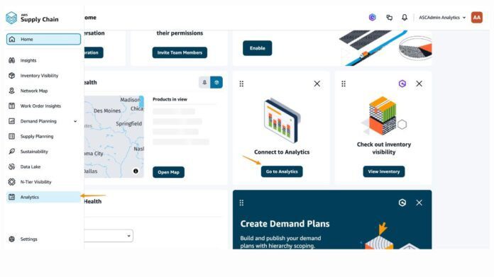 After this feature is activated, you may choose the Connecting to Analytics card or Analytics from the left navigation menu to access the AWS Supply Chain Analytics feature when you log in to AWS Supply Chain.